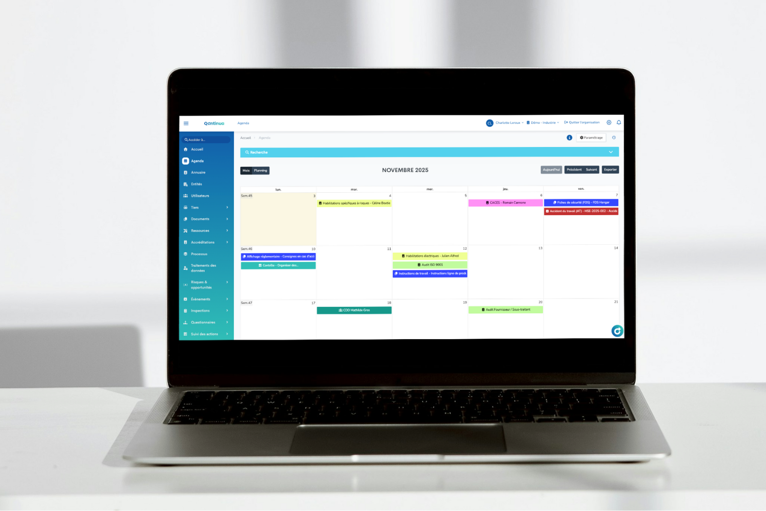 Formations, audits, contrats, documents, matériels… Le module Agenda regroupe vos échéances dans une seule vue claire et organisée.